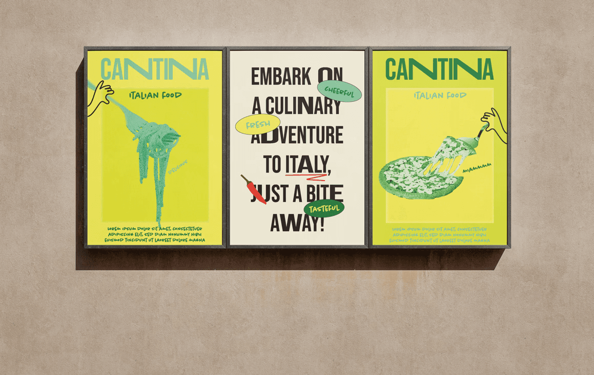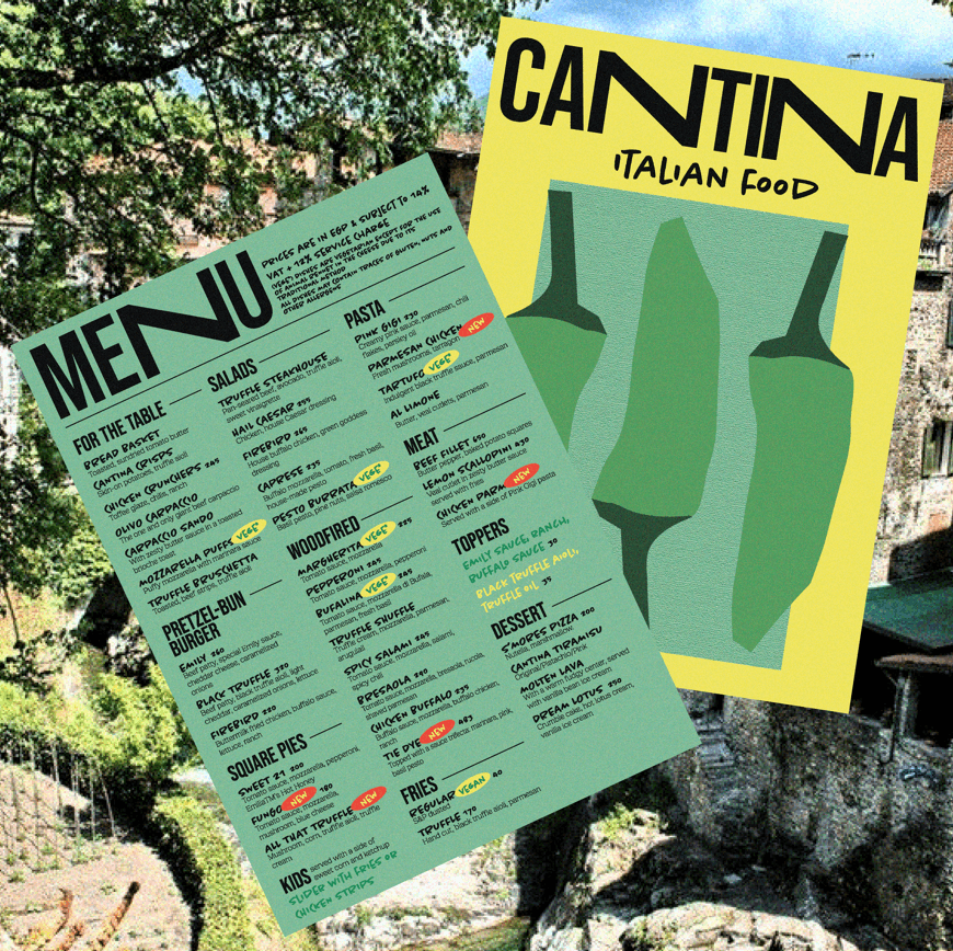 For Cantina, I developed vibrant and bold designs that echo the restaurant's lively Italian flair. By using the colors of the Italian flag—green, yellow, and red—in a subtle and modern way, I created a visual identity that feels both fresh and engaging. The designs include dynamic social media stories, attention-grabbing posters, and contemporary menus, all reflecting Cantina’s cheerful atmosphere.