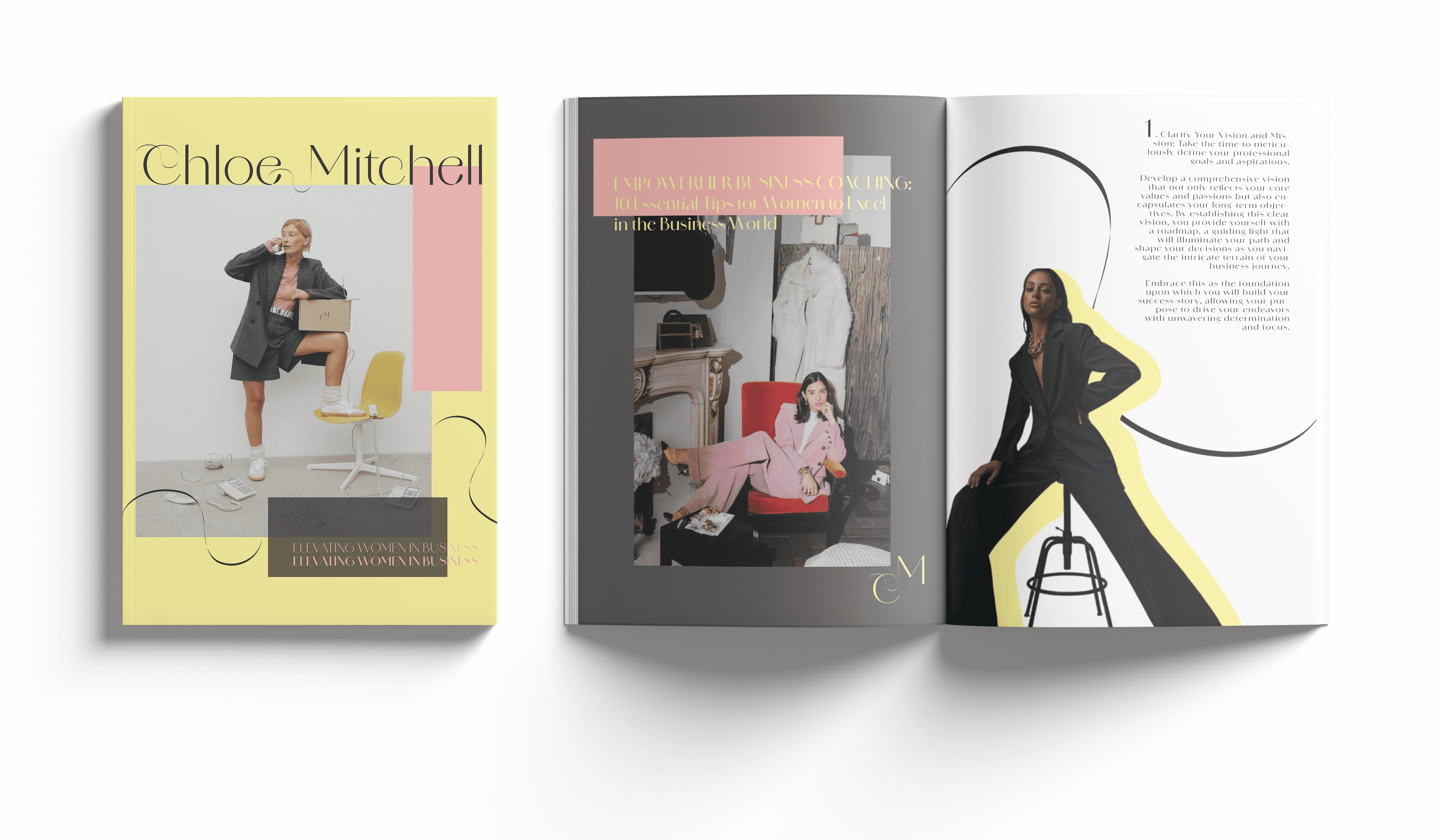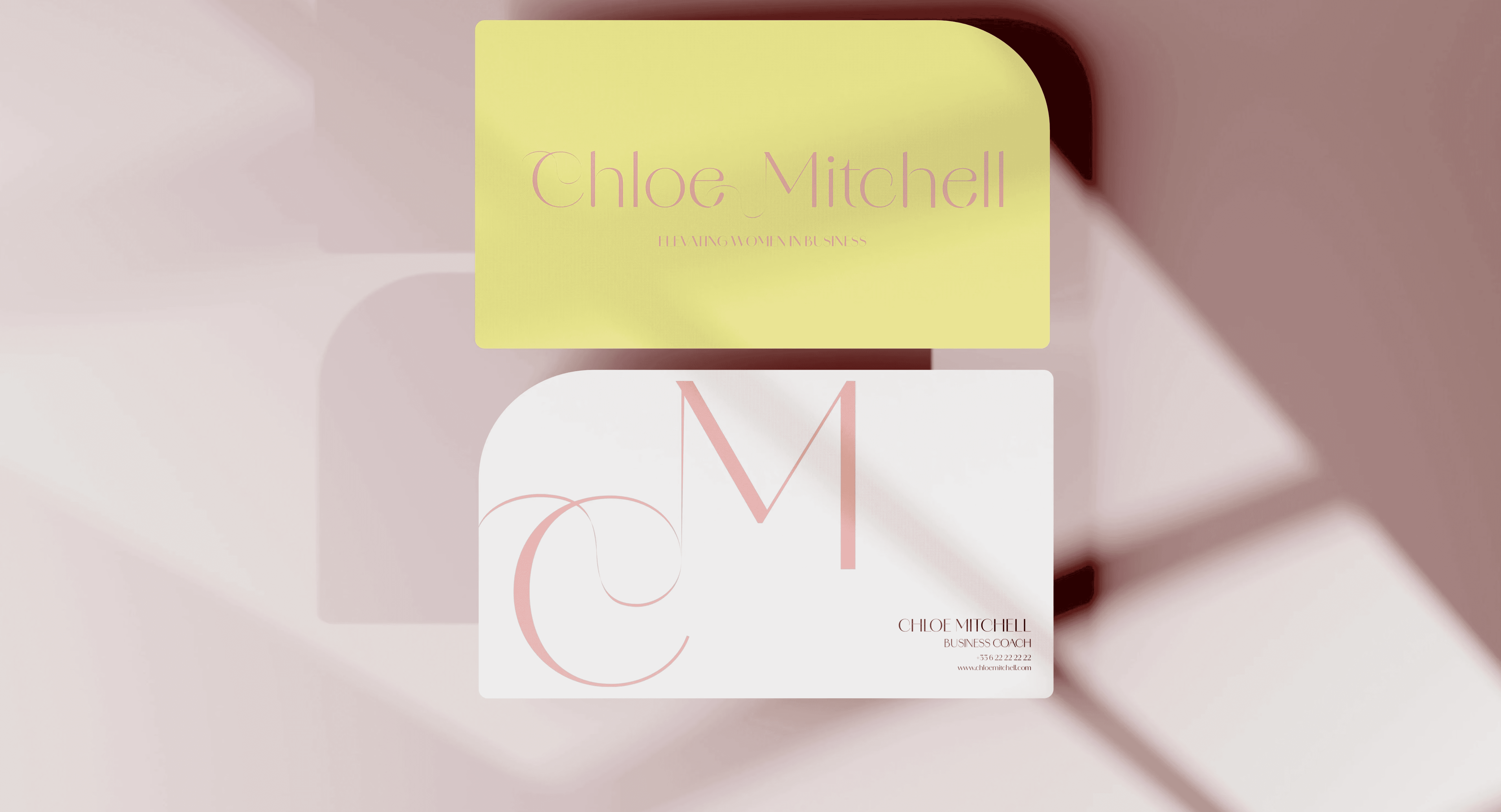 The visual identity for Chloe Mitchell reflects her brand’s blend of professionalism and approachability. Soft color palettes with pastel tones and elegant typography create a modern yet warm aesthetic. This design choice is aimed at resonating with her target audience—women in business—conveying both strength and support.