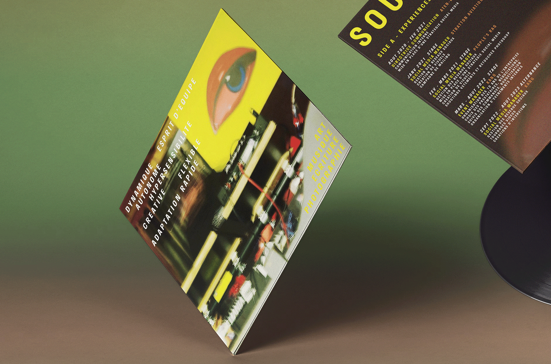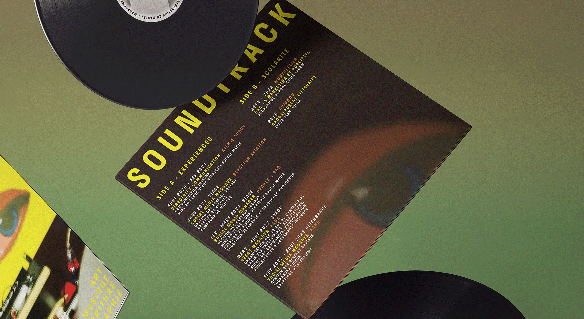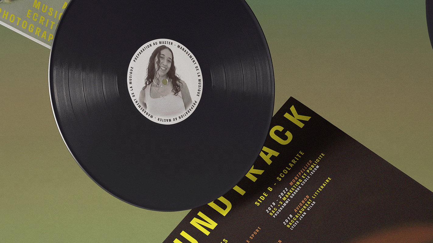 The concept behind the CV was to blend Linda’s interest in music with a distinctive, artistic presentation. The vinyl cover design symbolizes her connection to the music world, with an unconventional layout where records and the cover appear in a deconstructed, dynamic arrangement. This approach emphasizes her creative flair and ability to think outside the box.