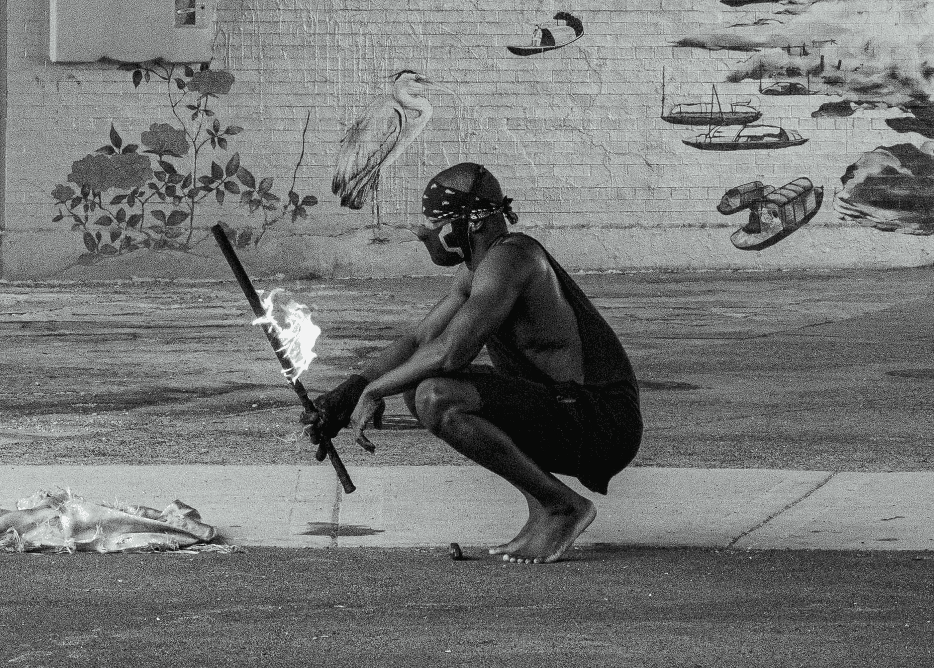 This project emerged from spontaneity and intuition. I aimed to capture the fluidity of the ninja's movements. A black-and-white photo shows him holding a fire staff, still and calm, suggesting that his next move will bring the world to life with color.
