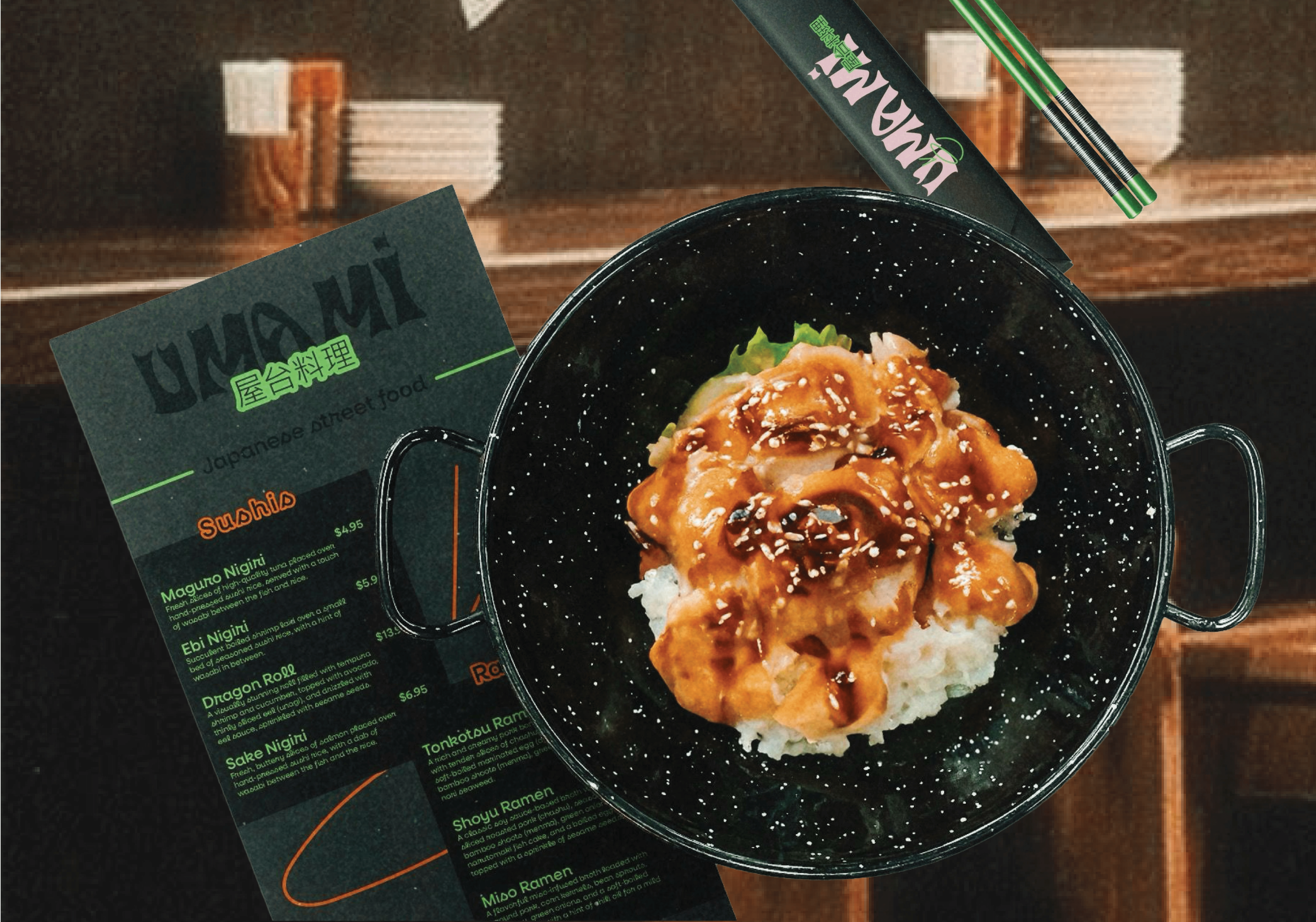 The branding for Umami captures the restaurant's energetic and urban essence, using bold typography and a striking color palette that reflects the intensity of its flavors. The visual identity is designed to be both modern and authentic, appealing to a diverse audience that appreciates the unique tastes and experiences of Japanese street food.